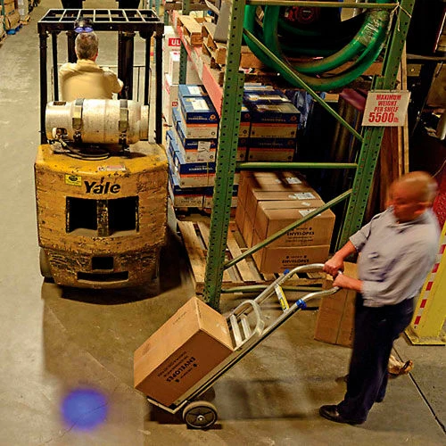 When the LED Safety Warning Spotlight assembly is mounted to a forklift, it projects bright blue spot beam pattern on the floor surface. Since multiple lights can be mounted onto a single forklift truck, the warning light spots can be seen behind or in front of the forklift. The bright light spot on the floor is clearly visible to pedestrians, machines and vehicles in the area, regardless of the ambient noise, alerting them to the nearby presence of the forklift. Traditional audio back up alarms can blend into ambient noise in the building and pedestrians can become immune to the audio warning.