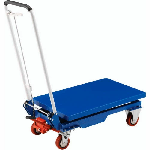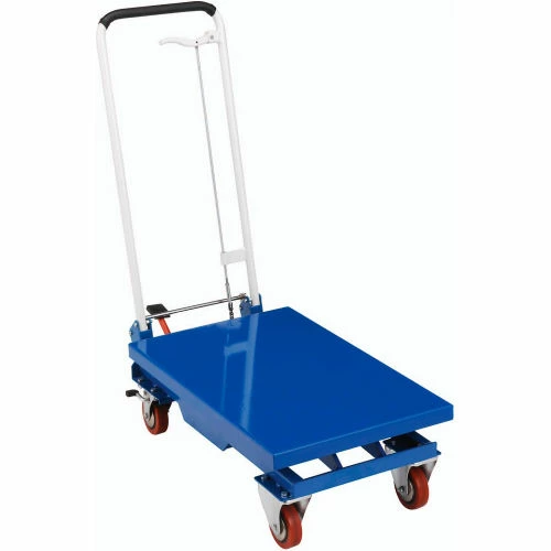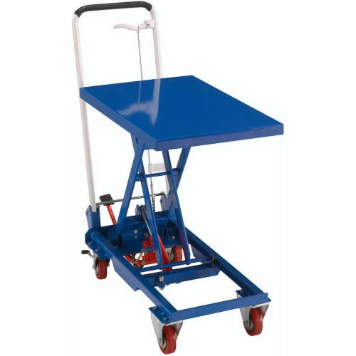 The Global Industrial™ Mobile Scissor Lift Table is a compact, maneuverable scissor lift that is an ergonomically efficient solution to lifting, transporting, and positioning heavy loads. Raise cargo to the perfect lifting height with the foot-operated hydraulic pump. Smoothly lower even heavy loads with the convenient finger release. Added safety from anti-slip rubber handle grips and pedal surfaces. Durable, chip-resistant powder coat finish. Rolls easily on 2 fixed and 2 swivel (with brakes) polyurethane casters. 2-Year Limited Warranty.