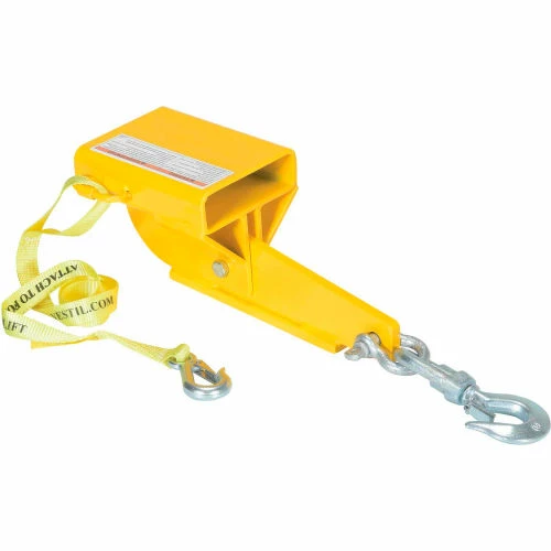 Converts your forklift into a mobile crane in seconds. All welded steel construction. Auto-tension hoisting hook offers a unique design that adds tension as weight is added. Secured to the fork truck by means of a 48″L safety restraint and tine lock. Swivel hook includes safety latch. Durable powder coat finish.