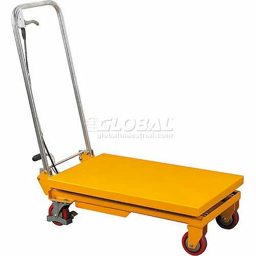 Scissor lift table provides an ergonomic solution to lifting, positioning and transporting heavy loads. Foot operated hydraulic lift pump raises the platform to any height within the lift range to reduce risk of injury from lifting and bending. Lift table offers a smooth rate of lowering using a fingertip release, regardless of weight of the load. Slip-resistant pedal surface and durable chip-resistant powder coat finish. Scissor lift table rolls easily on two swivel (with brakes) and two rigid polyurethane casters.